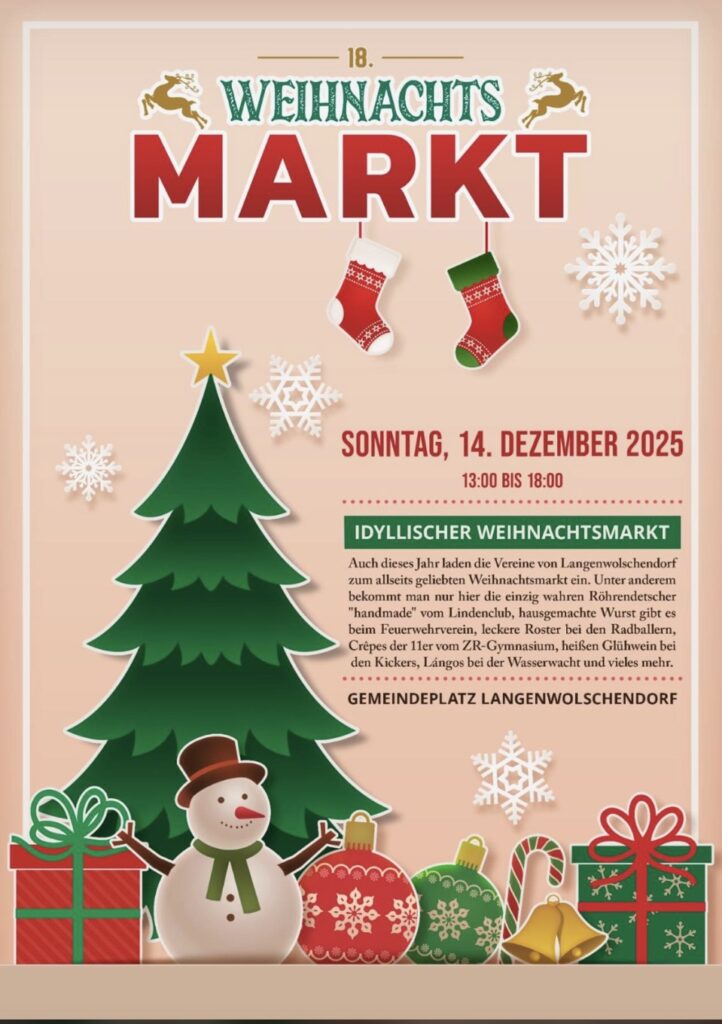 Auch dieses Jahr laden die Vereine von Langenwolschendorf zum allseits geliebten Weihnachtsmarkt ein. Unter anderem bekommt man nur hier die einzig wahren Röhrendetscher „handmade“ vom Lindenclub, hausgemachte Wurst gibt es beim Feuerwehrverein, leckere Roster bei den Radballern, Crêpes der 11er vom ZR-Gymnasium, heißen Glühwein bei den Kickers, Lángos bei der Wasserwacht und vieles mehr.