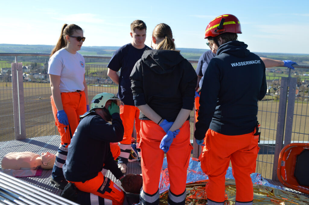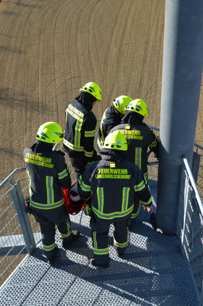 Dabei wurde die Feuerwehr Langenwolschendorf zu einer Einsatzübung zum Aussichturm auf der Schönen Höhe alarmiert. Angenommen wurde, dass sich mehrere verletzte Person auf dem Turm befinden. Am gleichen Tag führte die Wasserwacht Zeulenroda einen Ausbildungsnachmittag durch und war zufähig zu einer Team Building Maßnahme auf dem benachbarten Sportplatz zu gegen. Die verletzten Personen machten auf sich durch Hilfeschrei aufmerksam. Die Mitglieder der Wasserwacht machten sich direkt auf den Weg zum Aussichtturm. Sie konnten aufgrund des blockierten Drehkreuzes nicht direkt zu den Verletzten vorgehen und alarmierten die Feuerwehr Langenwolschendorf. Mit Eintreffen der Kameraden der Feuerwehr wurde die Nottür geöffnet. Die Mitglieder der Wasserwacht übernahmen die Erste Hilfe Maßnahmen. Dabei musste eine Person reanimiert werden. Die Kameraden der Feuerwehr unterstützten bei den Reanimationsmaßnahmen und hatten die Aufgabe, die verletzten Personen vom Turm zu tragen und den Landeplatz für den angeforderten Rettungshubschrauber vorzubereiten.